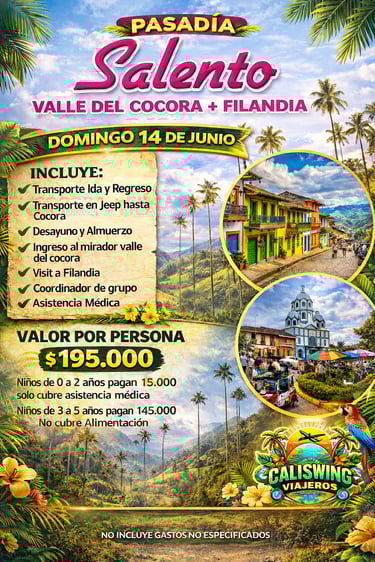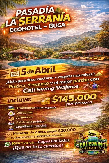 En Cali Swing Viajeros no solo hacemos pasadías… llevamos el swing caleño a cada destino. Somos una agencia que llega, impacta y deja huella, combinando organización, experiencias inolvidables y la mejor energía de Cali.Cada pasadía está pensado para que disfrutes al máximo, con alegría, ritmo, seguridad y momentos que se quedan para siempre. Desde que salimos hasta que regresamos, vivimos cada lugar con actitud, sabor y buena vibra.Con Cali Swing Viajeros, donde vamos…